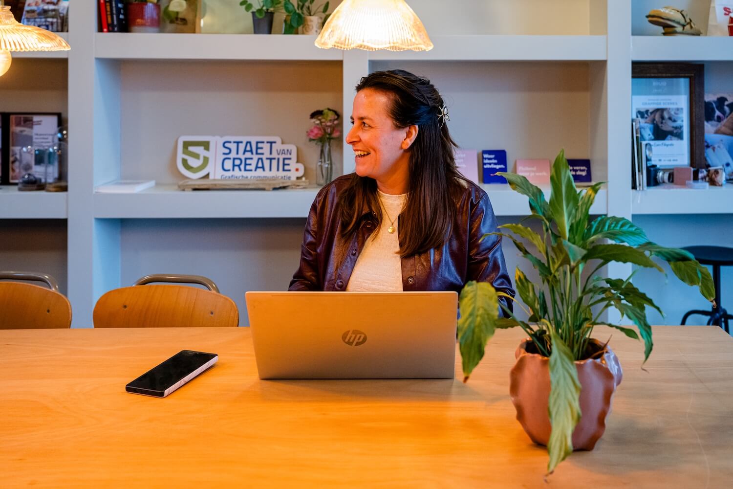"Meestal werk ik aan de werkbank achterin maar wanneer ik achter de computer werk zit ik het liefste bij het grote raam vooraan, met een zonnetje als het even kan."